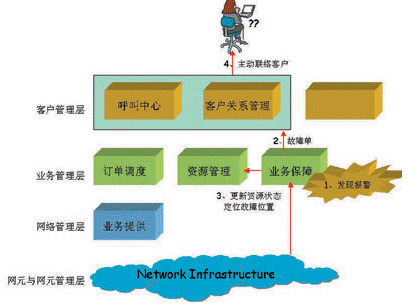 業(yè)務保障系統(tǒng)(如圖3所示)。該系統(tǒng)會隨時監(jiān)控網(wǎng)絡的可用性,當網(wǎng)絡上發(fā)現(xiàn)故障的時候,首先會產(chǎn)生一個故障單,通報故障處理系統(tǒng)和CRM系統(tǒng),同時也會跟資源管理系統(tǒng)進行交互,來實現(xiàn)對資源狀態(tài)的更新。同時在資源管理系統(tǒng)里面定位故障的位置,為盡快修復故障提供便利的手段。前端系統(tǒng)在監(jiān)測到故障的信息以后,能夠主動聯(lián)絡到客戶,并通知客戶由于某種原因客戶所購買的業(yè)務受到一些影響,以及運營商承諾在多長時間內(nèi)修復故障。
