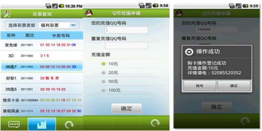 3)支付類業(yè)務(wù)手機客戶端頁面能夠直觀展現(xiàn)商品的特性,當用戶選擇了商品后,用戶的號碼信息和選擇商品信息通過手機客戶端與聲訊平臺之間的接口發(fā)送到聲訊平臺;然后聲訊平臺外呼完成身份驗證的過程,在驗證通過后利用聲訊平臺的計費能力完成支付。具體包括:Q幣充值、彩票投注、小額支付等。 下圖即為彩票投注和Q幣充值操作界面: