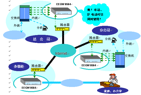 EEGW8564 FXO 網絡電話網關器利用國際電信組織ITU-T的H.323協(xié)議提供網際網絡上語音及傳真?zhèn)鬏,通過非對稱傳輸線路ADSL或CABLE MODEM等數(shù)據鏈路,將數(shù)據傳輸及語音/傳真服務集中于同一網絡,可節(jié)省相當可觀的電話費用支出。對于在各地擁有眾多分公司的企業(yè)及SOHO族皆相當適合。