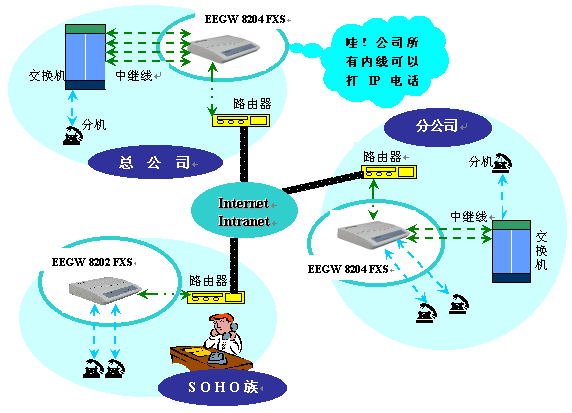 EEGW 8202和EEGW 8204網(wǎng)關(guān)利用現(xiàn)有的IP網(wǎng)絡(luò)資源實(shí)現(xiàn)語(yǔ)音通信,EEGW 8202提供2條線路,EEGW 8204提供4條線路,可以連接電話機(jī)或企業(yè)交換機(jī)。它由于只需支付上網(wǎng)費(fèi)而大幅度減少話費(fèi)支出,這是實(shí)現(xiàn)企業(yè)總公司與分公司間、SOHO族異地間通訊的最經(jīng)濟(jì)方案。