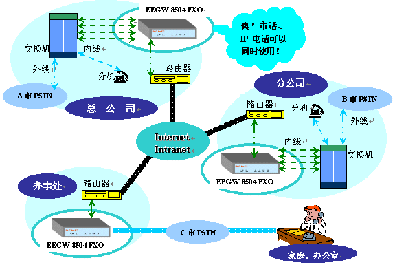 EEGW 8504網(wǎng)關(guān)利用現(xiàn)有的IP網(wǎng)絡(luò)資源實(shí)現(xiàn)語音通信,它提供4條線路可以連接PSTN網(wǎng)或企業(yè)交換機(jī)。它由于只需支付上網(wǎng)費(fèi)而大幅度減少話費(fèi)支出,這是實(shí)現(xiàn)企業(yè)總公司與分公司間、SOHO族異地間通訊的最經(jīng)濟(jì)方案。