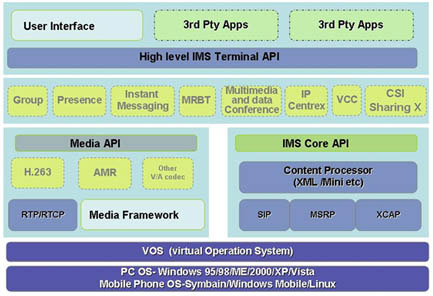 手機(jī)包括Symbian、Windows Mobile、Linux等版本,涵蓋當(dāng)前絕大多數(shù)高端手機(jī)用戶。除具有包括視頻通話的基本功能、呈現(xiàn)、群組管理與即時消息功能外,還擴(kuò)展了IP Centrex、多媒體彩鈴、VCC、CSI等功能。