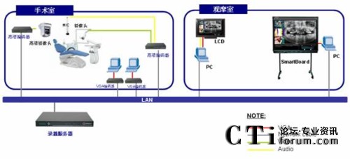 香港大學(xué)牙科醫(yī)院在手術(shù)室的旁邊設(shè)置了一間觀摩室,來進(jìn)行牙科手術(shù)示教,方便學(xué)生可以看到手術(shù)室里面的整個(gè)牙科手術(shù)過程。手術(shù)室里面安裝了兩個(gè)高清攝像頭,同時(shí),X光片及教學(xué)PPT也要在觀摩室中顯示。學(xué)生在觀摩室的LCD大屏幕顯示器觀看手術(shù)室里的手術(shù)的實(shí)時(shí)過程。整個(gè)手術(shù)的過程需要被錄制下來,學(xué)生以后還可以回放,而且整套系統(tǒng)應(yīng)該通過過IP網(wǎng)絡(luò)實(shí)現(xiàn),以方便院內(nèi)及院際間的牙科學(xué)術(shù)交流需要。