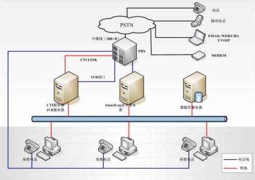 呼叫中心前端通信平臺(tái),主要由SIEMENS HiPath3800交換機(jī),計(jì)算機(jī)電話集成服務(wù)器(UltraCTI),交互式語(yǔ)音應(yīng)答服務(wù)器(ctsIVR),在線錄音監(jiān)聽(tīng)服務(wù)器(SmartLog),數(shù)據(jù)庫(kù)服務(wù)器,MCI服務(wù)器以及傳真服務(wù)器幾個(gè)部分組成。中繼線采用30B+D接入。