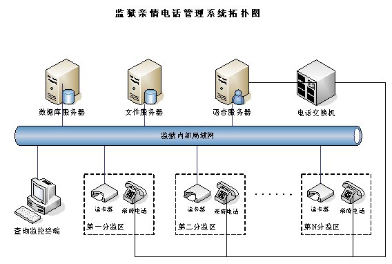 親情電話管理系統(tǒng)在系統(tǒng)設(shè)計(jì)中充分考慮監(jiān)獄的需求與特點(diǎn),不但包含了一般親情電話錄音所需的全部功能,而且還融合了獄政管理的功能,整個(gè)系統(tǒng)采用集中式方式,在中心機(jī)房部署一套親情電話錄音服務(wù)器,各個(gè)監(jiān)區(qū)監(jiān)控系統(tǒng)利用監(jiān)獄內(nèi)部的局域網(wǎng)聯(lián)結(jié)成一個(gè)整體,形成一個(gè)能監(jiān)控監(jiān)獄親情電話的全網(wǎng)。這樣即可以在每個(gè)監(jiān)區(qū)監(jiān)聽(tīng),也可以在監(jiān)獄內(nèi)部網(wǎng)的任何地方對(duì)親情電話進(jìn)行全程監(jiān)視。該系統(tǒng)能夠完全滿足目前監(jiān)獄的需求,產(chǎn)品性價(jià)比遠(yuǎn)遠(yuǎn)高于市場(chǎng)上其他同類產(chǎn)品。