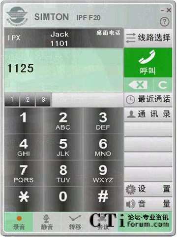 企業(yè)版需要另行購買,突出的功能包括“電子通信錄”、“軟電話與臺式電話機綁定”等!半娮油ㄓ嶄洝惫δ芤杨A裝在軟電話中,就像手機的通訊薄一樣。企業(yè)的員工不需要自己逐條輸入通訊錄,錄入與更新由企業(yè)的系統(tǒng)管理員在企業(yè)的通訊服務器上進行,一人操作,全公司通訊錄同步更新。一個集團公司或政府機構有成百上千個員工很正常,但要讓大家記住這幾百個電話號碼就很困難了,目前較為常見的解決辦法有以下幾種,小一點的企業(yè)或機構通常會打印一張通訊錄發(fā)放給每個員工,員工撥號前會先查一下這張通訊錄然后再將電話號碼在臺式辦公電話機上逐個輸入;規(guī)模大一點的企業(yè)會專門印制一本通訊薄發(fā)給每個員工,但由于機構龐大,往往等到通訊簿發(fā)到手上,其中有很多電話號碼已經(jīng)不正確了。F20型軟電話的“與臺式電話機綁定”功能就很好的解決了這個問題,通過將電腦上的軟電話與辦公桌上的臺式電話機進行綁定,企業(yè)中的所有員工在打電話時,都可以先點擊電腦軟電話中的通訊錄,快速找到需要的電話號碼,然后只需點擊這個號碼條,這個員工的臺式電話機就會自動向目標電話進行撥號,待對方摘機后,這個員工的臺式電話機就會響起鈴聲,此時摘機就可進行通話了。確實夠方便,夠實用!