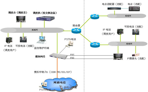 IP指揮調(diào)度語(yǔ)音通信系統(tǒng)由調(diào)度機(jī)、調(diào)度臺(tái)、媒體網(wǎng)關(guān)、IP電話、電臺(tái)適配器、電臺(tái)等設(shè)備組成,整體系統(tǒng)采用軟交換網(wǎng)絡(luò)的結(jié)構(gòu),構(gòu)建于以太網(wǎng)之上。傳輸網(wǎng)絡(luò)由通過路由器連接的多個(gè)局域網(wǎng)構(gòu)成;