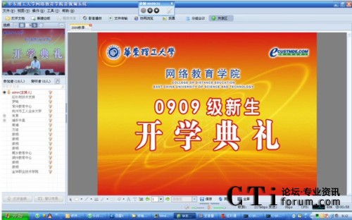 CTI論壇(ctiforum)9月30日消息:9月26日,華東理工大學網(wǎng)絡(luò)教育學院09級新生開學典禮上午9:00隆重舉行,主會場設(shè)在華東理工大學校本部(梅隴路130號)八教201室,并通過紅杉樹網(wǎng)絡(luò)視頻會議系統(tǒng)與校外各教育中心一起召開。