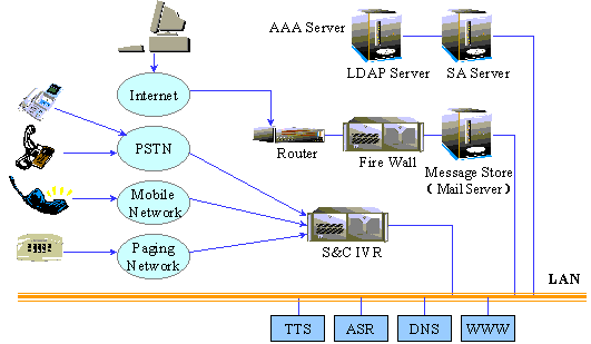 目前,S&C UMS統(tǒng)一消息系統(tǒng)由接入及交互式語音應(yīng)答模塊、VoIP接入模塊、傳真服務(wù)模塊、公用消息存儲及開放訪問服務(wù)器、LDAP(lightweight