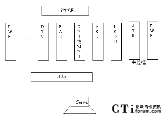 - CPU為256路主控板,對整個(gè)系統(tǒng)進(jìn)行主控,為整個(gè)系統(tǒng)提供時(shí)鐘入同步信號(hào)及交換網(wǎng),含一個(gè)10Base-T以太網(wǎng)口,通過HUB與Server進(jìn)行控制信息的交互