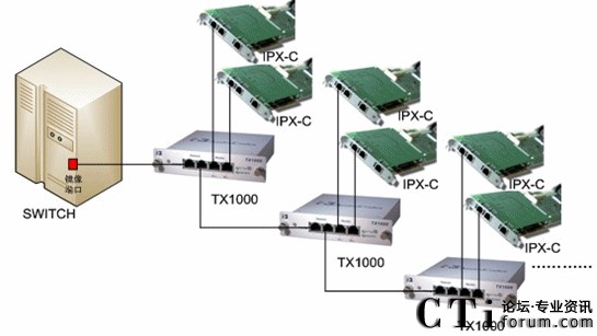ID上的數(shù)據(jù),實(shí)現(xiàn)千兆輸入,百兆輸出。這樣搭接的最大優(yōu)點(diǎn)在于TX1000是高阻搭接在網(wǎng)絡(luò)上的,保證了錄音系統(tǒng)對(duì)原有網(wǎng)絡(luò)上的數(shù)據(jù)沒(méi)有任何影響。