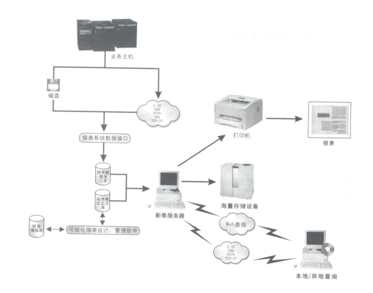 電子報表管理系統(tǒng)是集報表數(shù)據(jù)轉入、報表格式設計、海量存儲、自動管理和智能檢索于一體的計算機管理系統(tǒng)。它利用高速通道卡同銀行大機相連,將報表數(shù)據(jù)從大機下載至電子報表管理系統(tǒng)的主機上,由