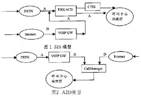 A2D法(Analog to Data) A2D法即事先將呼入呼叫中心的DTMF電話通過(guò)VoIP網(wǎng)關(guān)轉(zhuǎn)化為IP電話,再和來(lái)自Internet的IP電話一同接入座席代表。A2D法實(shí)現(xiàn)相對(duì)比較麻煩,但其將絕大部分工作放到計(jì)算機(jī)網(wǎng)絡(luò)這個(gè)開放的軟件平臺(tái)來(lái)做,除了有利于更新和開發(fā)外,還能降低成本。同時(shí),這種結(jié)構(gòu)能在地理上和物理上伸縮自如,不僅便于高度集成,而且便于跨地區(qū)構(gòu)建。