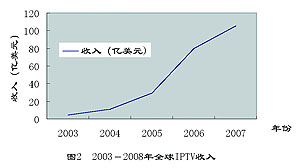 圖2 2003-2007年全球IPTV業(yè)務(wù)收入預(yù)測(cè)