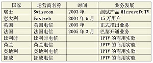 歐洲電信運(yùn)營(yíng)商在部署IPTV時(shí),主要采用三重服務(wù)(triple-play)業(yè)務(wù)模式占領(lǐng)市場(chǎng)。該業(yè)務(wù)模式有助于電信運(yùn)營(yíng)商與有線電視運(yùn)營(yíng)商的競(jìng)爭(zhēng)。目前,歐洲電信運(yùn)營(yíng)商已準(zhǔn)備或開(kāi)始IPTV的商業(yè)化進(jìn)程。