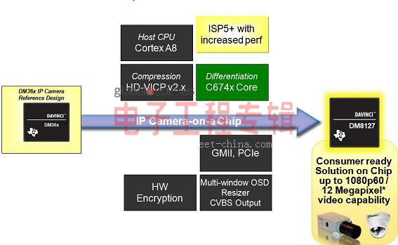 為了幫助客戶快速推出具有視頻分析功能的IP攝像機(jī),TI最近推出了第二代基于達(dá)芬奇DM8127+Aptina A10030千萬(wàn)像素級(jí)CMOS圖形傳感器的IP攝像機(jī)參考設(shè)計(jì)。其中,DM8127不但可支持一路H.264格式1080p每秒60幀編碼和多個(gè)不同分辨率的子碼流,還集成了主頻最高達(dá)750MHz的C674x DSP用以智能分析,以及最新的HD-VICP協(xié)處理器以支持高清編碼。
