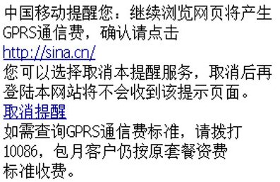 從2007年5月17日起,通過手機(jī)訪問WAP網(wǎng)站,中國移動向用戶主動提供一個收費提示頁面,提醒用戶“正在使用手機(jī)上網(wǎng)業(yè)務(wù),若繼續(xù)瀏覽網(wǎng)頁,將會產(chǎn)生GPRS通信費”。但打開中國移動夢網(wǎng)頁面,則不會有上述提示。