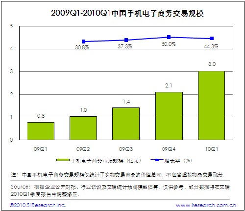 2010Q1中國(guó)移動(dòng)電子商務(wù)實(shí)物交易規(guī)模達(dá)到3.0億元,較2009Q4增長(zhǎng)44.3%,接近09年前三個(gè)季度實(shí)物交易規(guī)?偤。手機(jī)購(gòu)物體驗(yàn)不斷改善,用戶活躍度和付費(fèi)意愿增加,促進(jìn)訂單量大幅增加以及客單價(jià)上升,是本季度手機(jī)購(gòu)物交易規(guī)模快速增長(zhǎng)的重要原因。淘寶、當(dāng)當(dāng)和卓越等傳統(tǒng)電子商務(wù)企業(yè)推動(dòng)手機(jī)購(gòu)物市場(chǎng)快速發(fā)展,用戶通過(guò)手機(jī)購(gòu)物習(xí)慣培養(yǎng)是手機(jī)電子商務(wù)企業(yè)開(kāi)展的重點(diǎn)工作。艾瑞預(yù)測(cè)今年實(shí)物交易規(guī)模將保持高速增長(zhǎng)態(tài)勢(shì),市場(chǎng)活躍度將進(jìn)一步提高。