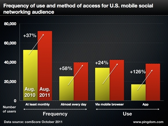 幾乎就在移動(dòng)互聯(lián)網(wǎng)爆發(fā)的同時(shí),社交網(wǎng)絡(luò)最近幾年的發(fā)展也可謂風(fēng)生水起,處于領(lǐng)導(dǎo)地位的則是Twitter和Facebook。將移動(dòng)互聯(lián)網(wǎng)和社交網(wǎng)絡(luò)整合,再加上地理定位服務(wù),就將擁有一組無(wú)與倫比的工具。這些工具被全球各地的人廣泛應(yīng)用于工作和生活之中。美國(guó)有超過(guò)50%的移動(dòng)用戶通過(guò)移動(dòng)網(wǎng)絡(luò)訪問(wèn)社交網(wǎng)絡(luò)服務(wù)。