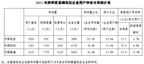 1.2011年四季度基礎(chǔ)電信企業(yè)用戶申訴分類統(tǒng)計表