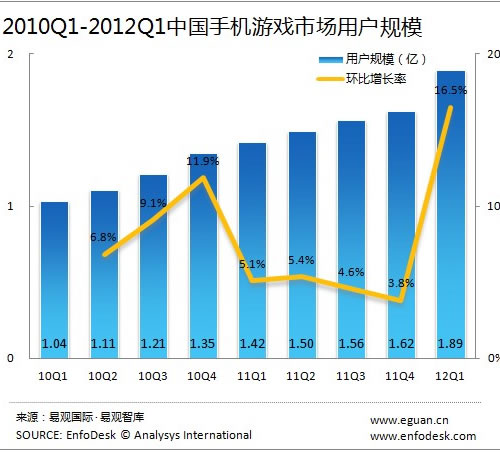 根據(jù)EnfoDesk易觀智庫產(chǎn)業(yè)數(shù)據(jù)庫最新發(fā)布的《2012年第1季度中國手機游戲市場季度監(jiān)測》數(shù)據(jù)顯示,中國手機游戲用戶規(guī)模穩(wěn)步增長,截止2012年第1季度達1.89億,環(huán)比增長16.51%。