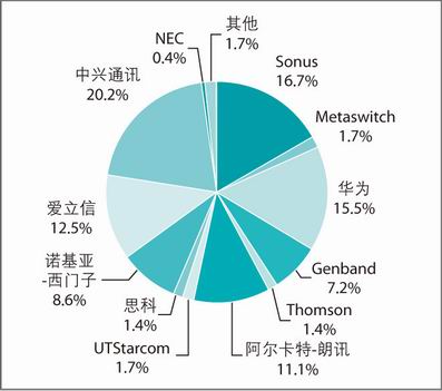 中興通訊VoIP軟交換設備憑借在國內(nèi)及印度等人口大國市場的最廣泛部署,2009年在有線和無線網(wǎng)絡VoIP總的通話分鐘數(shù)上以17.4%的市場份額領先其他設備商,位列全球第一(如圖2)。